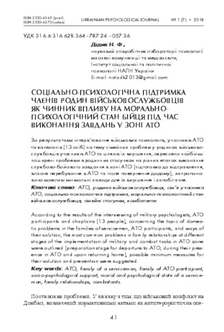 - Дідик, Наталія Федорівна (orcid.org/0000-0003-3084-2834) (2018) Socio-psychological support of the servicemen’s family members as the factor influencing the moral and psychological state of the combatant during the period of accomplishing tasks in ato zone Urkainian psychological journal, 1 (7). pp. 41-57. ISSN 2520-6265 (print), 2520-6273 (online)
