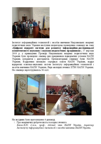 On September 17, 2018 a workshop was held at the premises of the Presidium of the National Academy of Educational Sciences of Ukraine on the theme "Digital open systems Use for the Scientific and Pedagogical Professionals' Informational and Research Competence Development" for employees of subordinate institutions of the National Academy of Educational Sciences of Ukraine, postgraduate students and doctoral students. The organizers of the workshop were: National Academy of Educational Sciences of Ukraine, Department of General Secondary Education of NAES of Ukraine, Department of Open Educational and Scientific information Systems of the information technologies and learning tools of NAES of Ukraine, Council of Young Scientists, information technologies and learning tools of NAES of Ukraine. The workshop was attended by 50 people.
