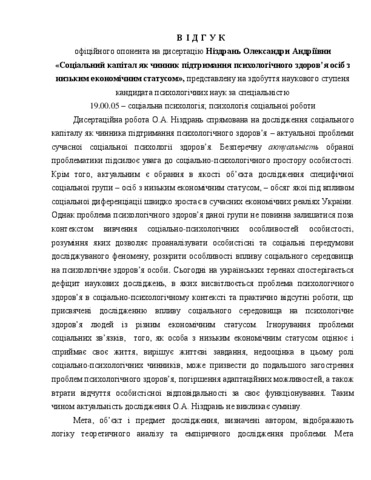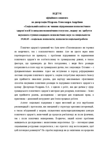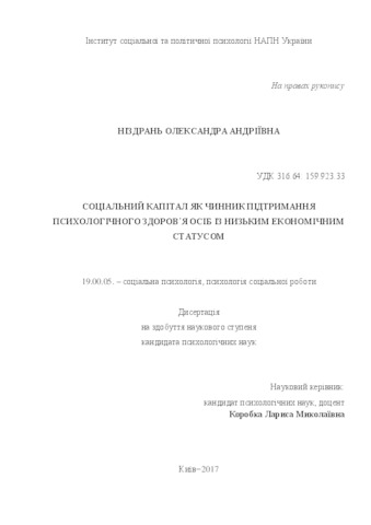 - Ніздрань, Олександра Андріївна (orcid.org/0000-0001-9676-9698) (2017) Social Capital as a Factor of Maintaining Psychological Health of the Persons with Low Economic Status Dissertation candidate thesis, Інститут соціальної та політичної психології.