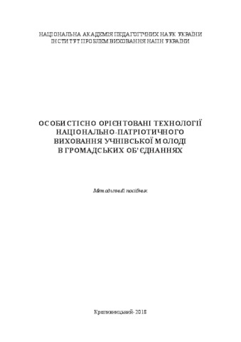 The content of the manual covers the content, forms, methods of national-patriotic education of pupils in public associations. Presented author's approach to implementation personally oriented technologies of national-patriotic education of pupils in public associations of different directions. The publication is addressed to coordinators, leaders of public associations, scientific and pedagogical workers, post-graduate students and students of pedagogical higher educational institutions, pedagogues-practitioners, specialists social work.