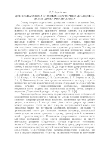 - Березівська, Лариса Дмитрівна (orcid.org/0000-0002-5068-5234) (2017) The source base of historical and pedagogical researches as a methodological problem In: Сучасні вимоги до організації та проведення історико-педагогічних досліджень : зб. матеріалів наук.-методолог. семінару . ДНПБ України ім. В. О. Сухомлинського, м. Київ, Україна, pp. 6-7. ISBN 978-617-7536-02-3