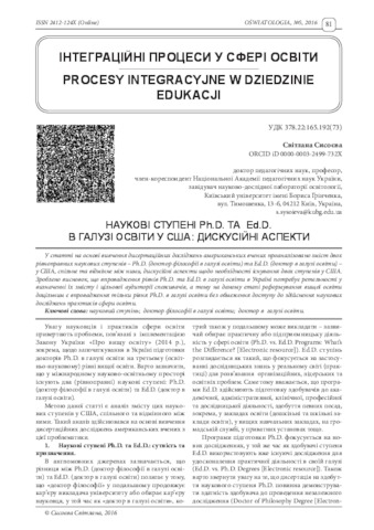 - Сисоєва, С.О. (orcid.org/0000-0003-2499-732X) (2016) Ph.d. and Ed.d. degrees in education in the Unated Sates: discussion Освітологія, 5. pp. 81-87. ISSN 2226-3012