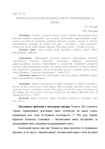 - Сисоєва, С.О. (orcid.org/0000-0003-2499-732X) and Мосьпан, Н.В. (orcid.org/0000-0001-8610-7965) (2015) New Law on Higher Education in Ukraine: Innovations and Risks Наукові записки Вінницького державного педагогічного університету імені Михайла Коцюбинського. Серія: Педагогіка і психологія (43). pp. 16-20. ISSN ISBN 978-966-2770-30-8