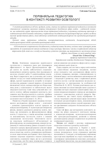 - Сисоєва, С.О. (orcid.org/0000-0003-2499-732X) (2014) Comparative pedagogy in the development of educology Освітологія, 3. pp. 17-23. ISSN 2226-3012
