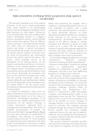 - Sysoieva, Svetlana (orcid.org/0000-0003-2499-732X) (2013) The concepts: interactive learning for adult learners Неперервна професійна освіта: теорія і практика, 3-4. pp. 55-59. ISSN 1609-8595