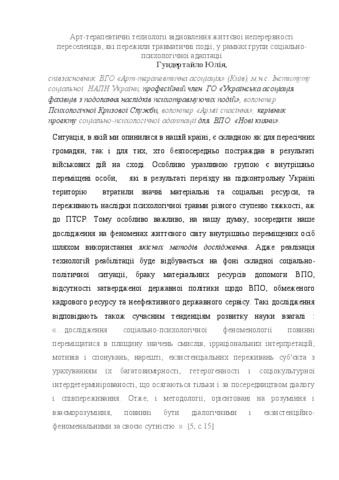 - Гундертайло, Юлія Данилівна (orcid.org/0000-0001-6959-663X) (2018) Art-therapeutic technologies for restoring the life continuity of immigrants who survived traumatic events within the group of socio-psychological adaptation In: Psychological assistance to the individual in difficult circumstances of life: a collection. theses of the reports of the All-Ukrainian scientific-practical seminar "Psychological assistance to the individual in difficult circumstances of life" . ЧНУ ім. Ю. Федьковича, м. Чернівці, Україна, pp. 124-127.