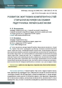 - Бондаренко, Неллі Володимирівна (orcid.org/0000-0002-4033-7287) and Косянчук, Сергій Володимирович (orcid.org/0000-0003-1334-6011) (2018) Development of the life skills of upper secondary school pupils by means of the textbook on the ukrainian language Проблеми сучасного підручника (21). pp. 44-56. ISSN 2411-1309