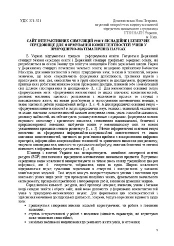 - Дементієвська, Н.П. (orcid.org/0000-0003-2985-3771) (2018) Site of interactive simulations Phet as a reliable and safe environment for students' competence development in natural sciences and mathematics In: Звітна наукова конференція Інституту інформаційних технологій і засобів навчання . ІІТЗН НАПН України, м. Київ, Україна, pp. 139-141.