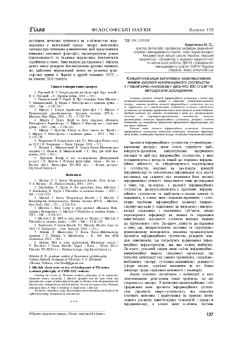 - Кириченко, М.О. (orcid.org/0000-0003-1756-9140) (2017) Conceptualization of cognitive–communicative dimensions of the ideology of the information society in the humanities and scientific discourse: research methodology Гілея: науковий вісник, 1 (116). pp. 137-141. ISSN 2076–1554