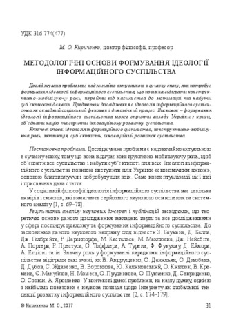 - Кириченко, М.О. (orcid.org/0000-0003-1756-9140) (2017) Basis of methodology for forming of the information society ideology Вісник НУ "Юридична академія України імені Ярослава Мудрого". Серія: Філософія, філософія права, політологія, соціологія, 3 (34). pp. 31-46. ISSN 2075-7190