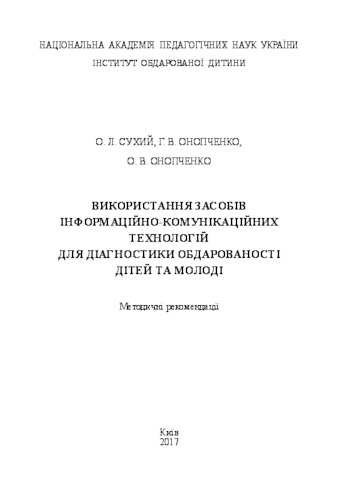 - Сухий, Олексій Лукич, Онопченко, Олена Василівна (orcid.org/0000-0001-9390-4639) and Онопченко, Галина Василівна (orcid.org/0000-0002-9346-7405) (2017) Use of information and communication technologies for the diagnostics of giftedness of children and youth [Teaching Resource]