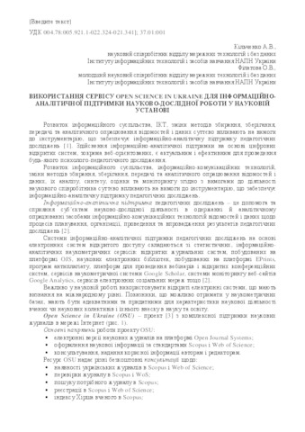 It is important in scientific work to use open electronic systems that have international recognition. Indicators that can be obtained in science-based databases must be adequate and suitable for characterizing the scientific activity of scientists or scientific groups and their contribution to science and education. Open Science in Ukraine - a project on comprehensive support for scientific journals on the Internet.
