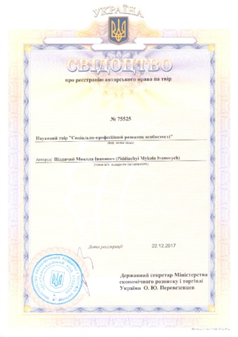 - Піддячий, Микола Іванович (orcid.org/0000-0001-6571-1450) (2017) Certificate for scientific work "Socio-professional development of personality" Міністерство економічного розвитку і торгівлі України, м. Київ, Україна.