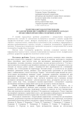 - Петренко, Лариса Михайлівна (orcid.org/0000-0002-7604-7273) (2018) Theoretical-methodological approaches to providing remote training in professional (professional and technical) education establishments Вісник Глухівського національного педагогічного університету імені Олександра Довженка. Педагогічні науки, 2 (37). pp. 90-96. ISSN 2410-0897