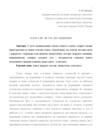 - Сисоєва, С.О. (orcid.org/0000-0003-2499-732X) (2011) Education as an object of research Шлях освіти, 2 (60). pp. 5-11. ISSN 0131-6788