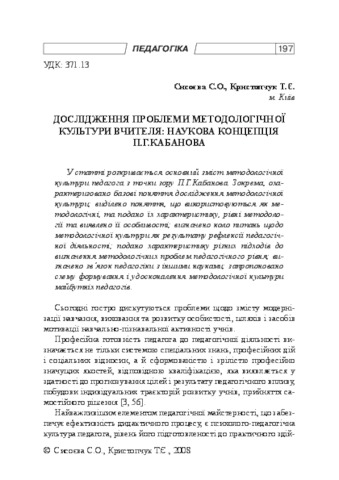 - Сисоєва, С.О. (orcid.org/0000-0003-2499-732X) and Кристопчук, Т.Є. (2009) Investigation of the problem of the methodological culture of a teacher: the scientific concept of P.G. Kabanov Педагогічний процес: теорія і практика, 1. pp. 197-208. ISSN 2078-1687