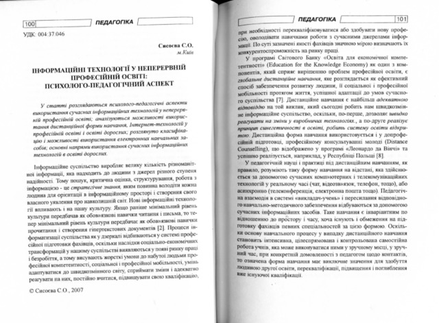 - Сисоєва, С.О. (orcid.org/0000-0003-2499-732X) (2007) Information technologies in continuing professional education: psychological and pedagogical aspect Педагогічний процес: теорія і практика, 4. pp. 100-107. ISSN 2078-1687