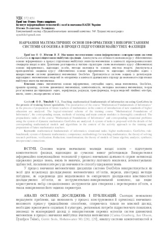 - Юнчик, В.Л. (orcid.org/0000-0003-3500-1508) and Гриб'юк, О.О. (orcid.org/0000-0003-3402-0520) (2018) Teaching mathematical fundamentals of informatics on using GeoGebra in the process of training future specialists. VIІ Міжнародна науково-практична конференція «Математика. Інформаційні технології. Освіта», 1 (5). pp. 35-47.