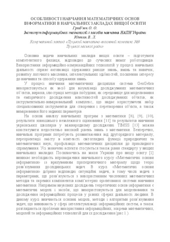 - Юнчик, В.Л. (orcid.org/0000-0003-3500-1508) and Гриб'юк, О.О. (orcid.org/0000-0003-3402-0520) (2018) Peculiarities of teaching mathematical fundamentals of informatics in educational institutions of higher education In: VIІ Міжнародна науково-практична конференція «Математика. Інформаційні технології. Освіта» , 1 (5). Східноєвропейський національний університет імені Лесі Українки, м. Луцьк, Україна, pp. 141-146.