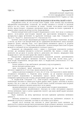 - Барладим, В.М. (orcid.org/0000-0002-5564-671X) (2018) The place of computer modeling in non-formal education In: Звітна наукова конференція Інституту інформаційних технологій і засобів навчання НАПН України . Інститут інформаційних технологій і засобів навчання НАПН України, м. Київ, Україна, pp. 131-132.