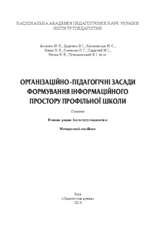 Піддячий, Микола Іванович (orcid.org/0000-0001-6571-1450), Доротюк, Валентина Іванівна, Левченко, Надія Григорівна, Туташинський, Василь Іванович, Чудакова, Віра Петрівна, Кохан, О. В., Ассанов, М.О., Рогоза, В.В. and Коляновська, М.С. (2013) Organizational-pedagogical principles of formation of the informational space of the profile school . Педагогічна думка, м. Київ, Україна. ISBN 978-966-644-335-2