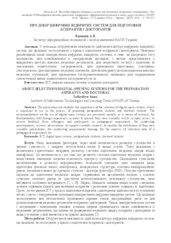 - Яцишин, А.В. (orcid.org/0000-0001-8011-5956) (2018) About the selection of digital open systems for preparation of postgraduate students and doctoral students In: Тези доповідей ІV Міжнародної науково-практичної конференції «Інформаційні технології в освіті, науці і техніці» (ІТОНТ-2018): Черкаси, 17-18 травня 2018 р. . ЧДТУ, м. Черкаси, Україна, pp. 250-252. ISBN 978-966-9730-14-5