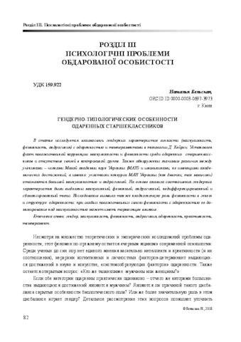 - Бєльська, Н.А. (orcid.org/0000-0003-0697-3973) (2018) Features of gender typology of gifted high school students Навчання і виховання обдарованої дитини: теорія та практика, 1 (20). pp. 82-91. ISSN 2310-1598