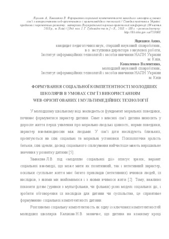 - Коваленко, В.В. (orcid.org/0000-0002-4681-5606) and Яцишин, А.В. (orcid.org/0000-0001-8011-5956) (2018) Formation of social competence of junior pupils in a family with the use of web-oriented and multimedia technologies In: Сімейна політика в Україні: проблеми і перспективи розвитку: матеріали Всеукраїнської науково-практичної конференції (04 квітня 2018 р., м. Київ) . Інститут соціальної та політичної психології НАПН України, м. Київ, Україна, pp. 173-177.