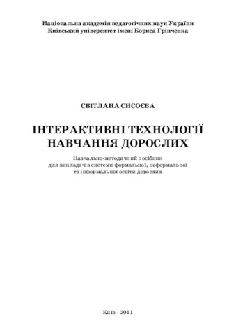The teaching manual consists of two parts and appendices. The first part deals with: the concept of "interactivity"; the essence and definitions of andragogy; andragogical model of interactive learning; psychological peculiarities of adult education and requirements for andragog. The second part examines the criteria for the effectiveness of interactive technologies in adult learning; active forms and teaching methods as elements of interactive technologies. Examples of case-method use are given in the appendixes; A comparative analysis of the educational capabilities of the most commonly used distance learning systems that can be used in adult learning is provided. Educational and methodical manual is addressed to teachers-andragogs of the system of formal, informal and informational education of adults; teachers of higher educational establishments and institutions of postgraduate education; scholars who are interested in adult education.