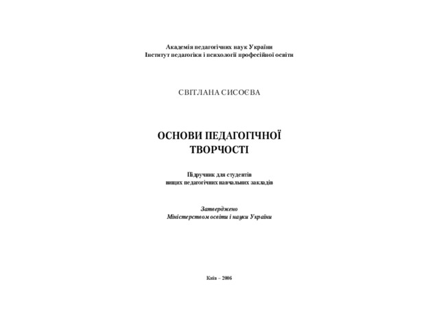 Сисоєва, С.О. (orcid.org/0000-0003-2499-732X) (2006) Fundamentals of pedagogical creativity . Міленіум, м. Київ, Україна. ISBN 966-80-63-87-7
