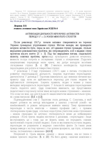 - Лещенко, Л.М. (2018) Activation of the activities of the inhuman activists of the 17th-21st century In: Розвиток освіти в добу Української революції (1917–1921) : зб. матеріалів Всеукр. наук.- практ. семінару . ДНПБ України ім. В. О. Сухомлинського, м. Київ, Україна, pp. 63-65. ISBN 978-617-7536-02-3