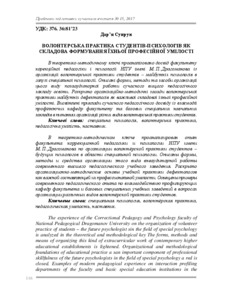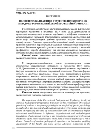 - Супрун, Д. М. (orcid.org/0000-0003-4725-094X) (2017) Volunteer practice of students-psychologists as a component of the formation of their professional abilities Проблеми підготовки сучасного вчителя (15). pp. 116-123. ISSN 2307-4914