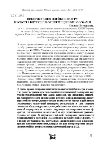 - Савінов, Володимир Вікторович (orcid.org/0000-0001-5830-2333) (2018) Use the Playback Theatre in the Work with Internally Displaced Persons Простір арт-терапії, 1 (23). pp. 53-65. ISSN 2310-3159