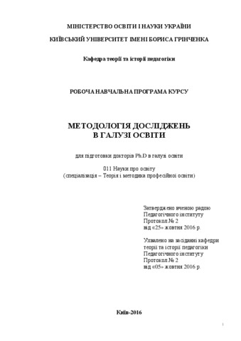 The purpose of the course "Methodology of Research in Education" is the development of future scientists of methodological culture, a holistic system of scientific knowledge on the organization and conduct of research in the field of education (disciplinary and interdisciplinary), in particular on the theory and methodology of vocational education.