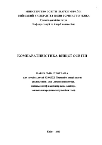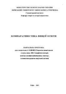 The curriculum "Comparative Studies of Higher Education" was developed on the basis of an educational professional program for the preparation of masters in accordance with the curriculum of specialty 8.180110021 "Pedagogy of the Higher School" of full-time education taking into account the recommendations of the Ministry of Education and Science of Ukraine (Letter No 1/9-736 dated on 06.12.2007). "On the List of directions (specialties) and their combination with additional specialties and specializations for the preparation of pedagogical workers for the educational qualification levels of the bachelor, specialist, master's degree". The curriculum is developed on the basis of a competent approach to the training of future specialists.