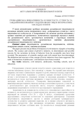 - Алєксєєнко, Т.Ф. (orcid.org/0000-0002-2060-2354) (2018) Civic initiative of the individual: the essence and objectives of education in adolescence in residential institutions of education In: ІІІ Міжнародна науково-практична конференція "Психолого-педагогічні проблеми вищої і середньої освіти в умовах сучасних викликів: теорія і практика" . «Стиль-Издат», м. Харків, Україна, pp. 123-127.