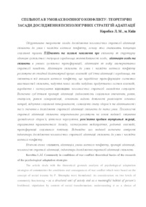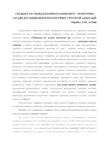 The article deals with the theoretical grounds analysis of psychological adaptation strategies of communities for conditions and consequences of war conflict which were based on the concept of social trauma by P. Shtompka were formulated: its consideration on two levels of community functioning – as a structural unit of society and as a meaningful habitat of person’s livelihood; stipulation by content of social transformation; understanding it as a choice of alternative strategies of behavior. The community adaptation to the conditions and consequences of military conflictt is described as а complex multidimensional process of interaction between the subject of adaptation and the environment which changes under the influence of military conflict that allows for the transformation of the system properties of community, active development of new social conditions, acquisition of means for making productive system of interaction, development and application of the adaptation’s psychological strategies. The objective and subjective criteria of community adaptation were separated. The importance of subjective criteria was shown: satisfaction of the various components of life, feeling social support, feeling social integration, subjective well-being, self-esteem of health and adaptability. The strategies of psychological adaptation were proposed to consider on basis of the models: strengthening community health, understanding on values, solving the problems of internal migration, processing the traumatic experience, application of mediapractices, family interaction, transformation of social capital. According these models the indicators of the research were defined.