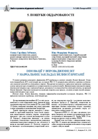 - Зубченко, Олена Сергіївна and Федорова, Н.Ф. (orcid.org/0000-0003-4382-4686) (2018) Innovations in Implementation of ICT in Educational Institutions of Great Britain Education and Development of Gifted Personality, 1 (68). pp. 62-74. ISSN 2309 ‑3935