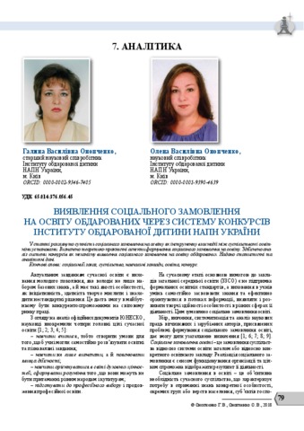 - Онопченко, Галина Василівна (orcid.org/0000-0002-9346-7405) and Онопченко, Олена Василівна (orcid.org/0000-0001-9390-4639) (2018) Identification of social demand for education of gifted students through the system of competitions of Institute of gifted child Education and Development of Gifted Personality, 1 (68). pp. 79-83. ISSN 2309‑3935