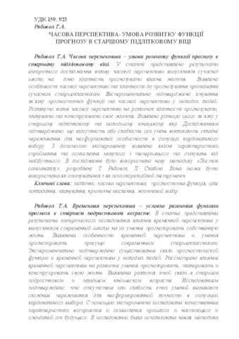- Рябовол, Т.А. (2018) Time perspective as a condition for prediction function development in late adolescence Актуальні проблеми психології. Психологія особистості. Психологічна допомога особистості, 17 (11). pp. 182-199. ISSN 2072-4772