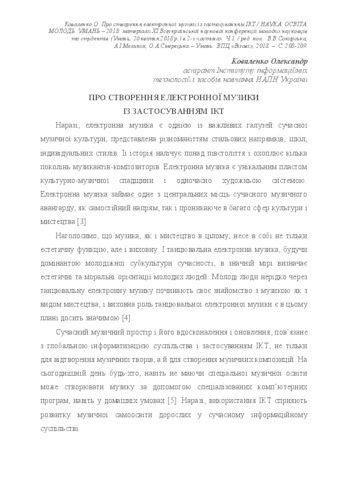- Коваленко, О.М. (2018) About the creation of electronic music using ICT In: Наука. Освіта. Молодь. Умань – 2018: матеріали ХІ Всеукраїнської наукової конференції молодих науковців та студентів (м. Умань, 26 квітня 2018 р.) , 1 . ВПЦ «Візаві», м. Умань, Україна, pp. 208-209.