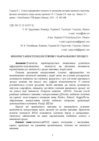 - Гущина, Н.І., Цирульник, С.М. and Непийвода, М.В. (2018) The use of BYOD technologies in the educational process Сучасні інформаційні технології та інноваційні методики навчання у підготовці фахівців: методологія, теорія, досвід, проблеми (51). pp. 162-168. ISSN 2412-1142