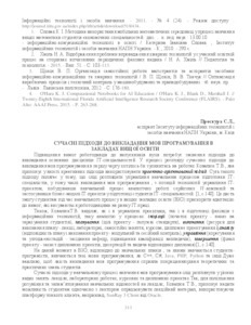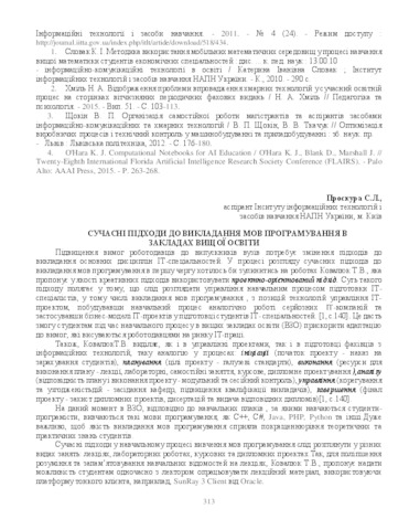 - Проскура, С.Л. (orcid.org/0000-0002-9536-176X) and Литвинова, С.Г. (orcid.org/0000-0002-5450-6635) (2017) Modern approaches to teaching programming languages in higher education institutions In: V Всеукраїнська науково-практична конференція молодих учених «Наукова молодь-2017» . Інститут інформаційних технологій і засобів навчання НАПН України, м. Київ, Україна, pp. 313-315.