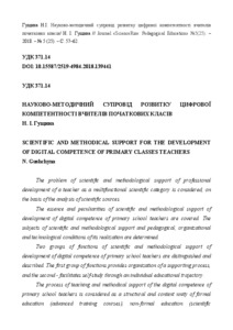 The problem of scientific and methodological support of professional development of a teacher as a multifunctional scientific category is considered, on the basis of the analysis of scientific sources. The essence and peculiarities of scientific and methodological support of development of digital competence of primary school teachers are covered. The subjects of scientific and methodological support and pedagogical, organizational and technological conditions of its realization are determined. Two groups of functions of scientific and methodological support of development of digital competence of primary school teachers are distinguished and described. The first group of functions provides organization of a supporting process, and the second - facilitates self-study through an individual educational trajectory. The process of teaching and methodical support of the digital competence of primary school teachers is considered as a structural and content unity of formal education (advanced training courses), non-formal education (scientific methodological work in the intercourse period) and informational education (selfeducation of the teacher) throughout all professional activities. The methodical products developed in the course of scientific and methodological support of development of the digital competence of primary school teachers in the conditions of the project activity are briefly described: the program of the special course "Development of the digital competence of the teacher of elementary school classes of the New Ukrainian school", the program of the selective training module "Digital competence of the teacher of the New Ukrainian school", training program "Model of training "1 student to 1 computer". The developed scientific and methodological support for the development of the digital competence of primary school teachers builds the system of involving teachers in the process of active use of digital technologies in their pedagogical practice and awakening their creative potential and readiness for independent activity in the informational and educational environment.
