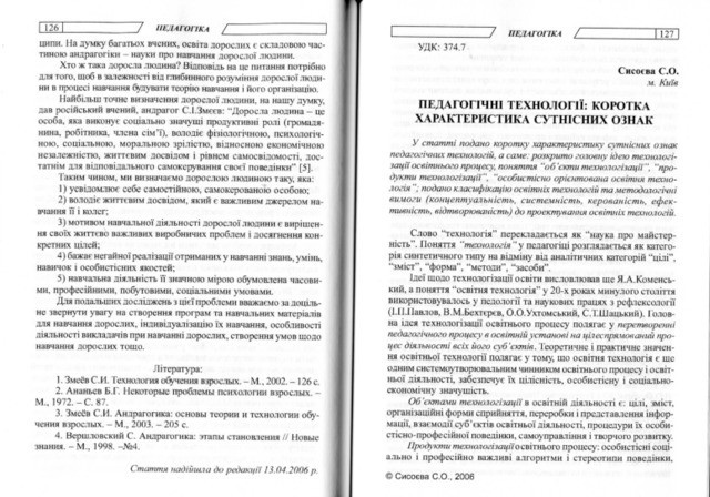 - Сисоєва, С.О. (orcid.org/0000-0003-2499-732X) (2006) Pedagogical technologies: a brief description of the essential features Педагогічний процес: теорія і практика, 2. pp. 127-131. ISSN 2078-1687