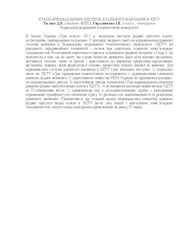 - Теслюк, Д.В. and Герасименко, І.В. (orcid.org/0000-0001-6678-8142) (2018) Stages of implementation of the system of dual education in the ChSTU In: Збірник тез студентської конференції ЧДТУ . ЧДТУ, м. Черкаси, Україна, p. 1.