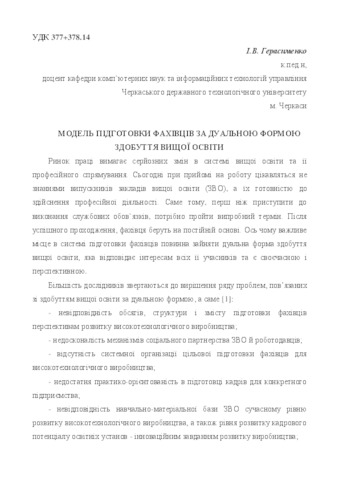 - Герасименко, І.В. (orcid.org/0000-0001-6678-8142) (2018) Model of training of specialists in the dual form of higher education In: ІІІ All-Ukrainian Electronic Scientific and Practical Conference "Open Education and Distance Learning: From Theory to Practice" . ДВНЗ «Ун-т менеджменту освіти» НАПН України, м. Київ, Україна. ISBN 978-966-355-128-9