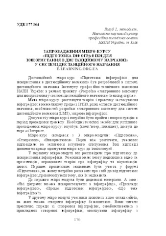 - Голуб, І.І. (orcid.org/0000000190086255) (2016) Implementation of the micro-course "Preparing infrastructure for use in distance education" in the System of restication teaching e-learning.org.ua In: Професійна освіта в умовах сталого розвитку: збірник Матеріалів І Міжнародної науково - практичної конференції (м. Київ, 1 грудня 2016 р.) . ІМА-прес, м. Київ, Україна, pp. 176-178. ISBN 978-966-331-581-2