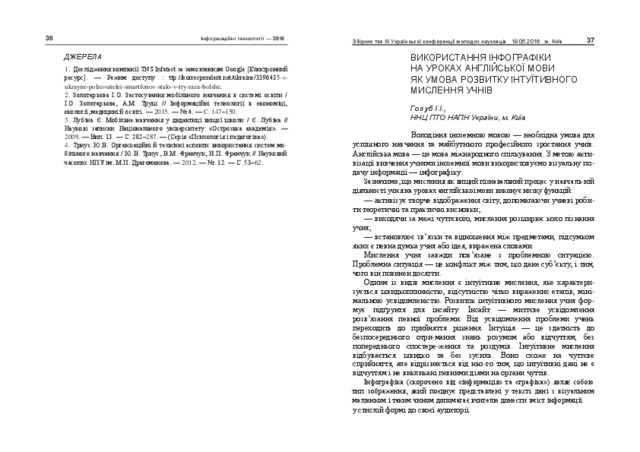 - Голуб, І.І. (orcid.org/0000000190086255) (2016) Usage of infographics on english language lessons as a condition for the development of intellectual intelligence of students In: Збірник тез IІІ Української конференції молодих науковців "Інформаційні технології - 2016" (19.05.2019 р., м. Київ) . Київський університет імені Бориса Грінченка, м. Київ, Україна, pp. 37-39.