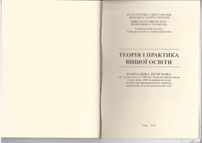 The curriculum "Theory and practice of higher education" was developed on the basis of an educational professional program for the preparation of masters in accordance with the curricula of specialties 8.180110021 "Pedagogics of higher education" of full-time education taking into account the recommendations of the Ministry of Education and Science of Ukraine (Letter No 1/9-736 dated on 06.12. 2007) "On the List of Directions of Specialties) and their combination with additional specialties and specializations for the preparation of pedagogical workers for the educational qualification levels of the bachelor, specialist, master's degree." The curriculum is developed on the basis of a competent approach to the training of future specialists.